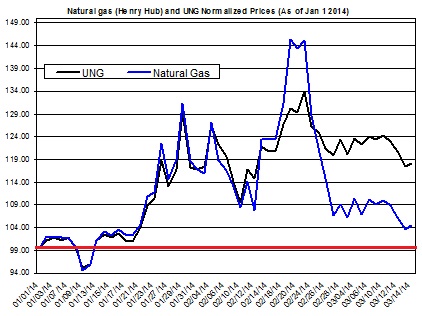 UNG has outperformed the price of natural gas mainly in the past several weeks. If the future markets remain in backwardation, and if the price of natural gas continues to fall when UNG rolls over its future contracts, the price of UNG will remain above the price of natural gas.