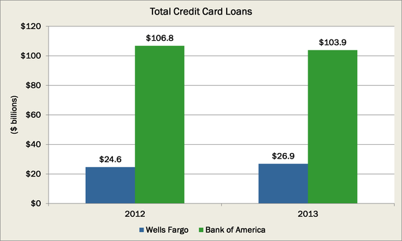 At the end of 2013, Wells Fargo reported it had watched its credit card loans outstanding grow by 9%, or $2.2 billion. By comparison Bank of America watched its loans fall by $2.9 billion. However it is critical to note Bank of America has a staggering lead in the actual amount of credit card loans that are extended, as it had a nearly four times higher number:
