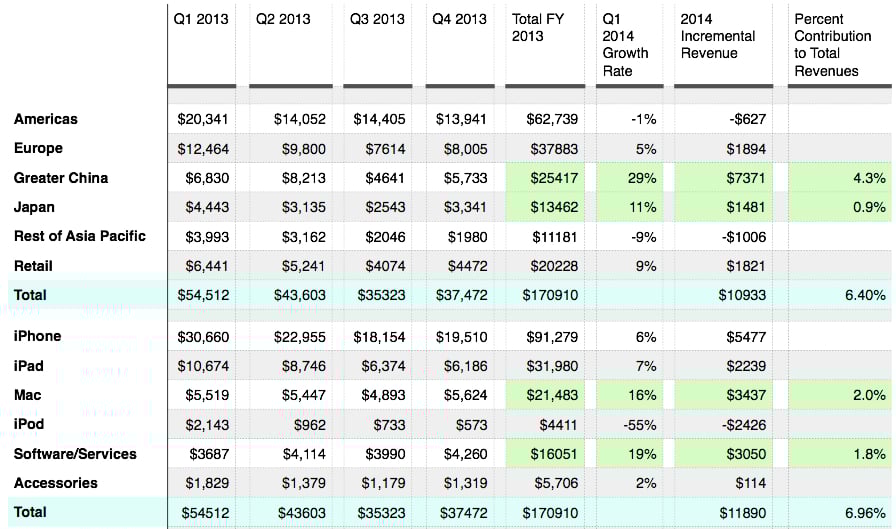 The green rows are the regions and product lines currently showing double digit revenue growth-the type of growth the street is looking for in a tech stock. Yet, the green columns also present Apple's current revenue challenge: The company's fastest growing regions (China, Japan) and product lines (Mac, Software/Services) are currently not large enough to push total company revenue growth into double digits. If growth rates don't change the company would see 2014 revenue growth in the range of 6.4%-7%. (The difference in the growth rates between tables is due to the rounding errors caused by a region vs. product line comparison.)