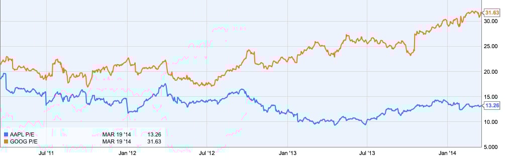 The divergence in P/E for Google and Apple over time (graph below) is a stark demonstration of investor confidence in each company's revenue growth prospects. For perspective, a P/E of 31.8 would have Apple stock trading above $1,200.
