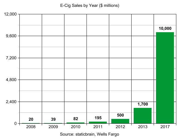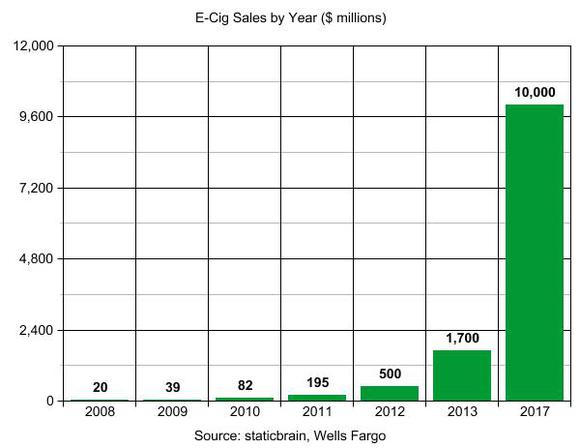 According to Wells Fargo, which assiduously tracks the e-cig market, sales are expected to hit $10 billion by 2017. That's still just a relatively small percentage of the overall $100 billion tobacco industry, but with triple-digit growth rates still in its future, e-cigs have the potential to eventually surpass tobacco sales.