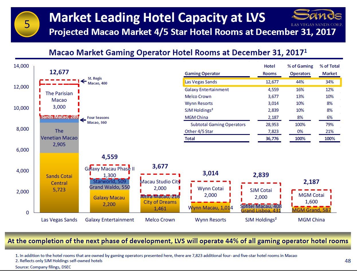 All in all, management is planning to have more than 12,600 hotel rooms and apartments in Macau by 2017, and this would make Las Vegas Sands the leading player in the region by a considerable margin, with a market share of 44% among gaming operators.