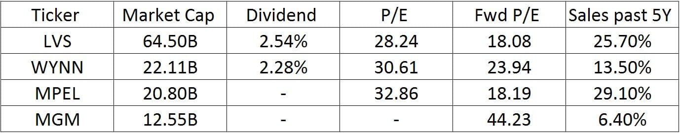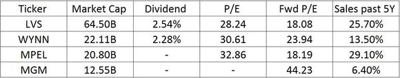 Comparing valuation ratios for Las Vegas Sands versus other casino operators with big presence in Macau, such as Wynn Resorts, Melco Crown, and MGM, the company looks moderately valued, especially considering Las Vegas Sands' remarkable growth rates over the last few years.