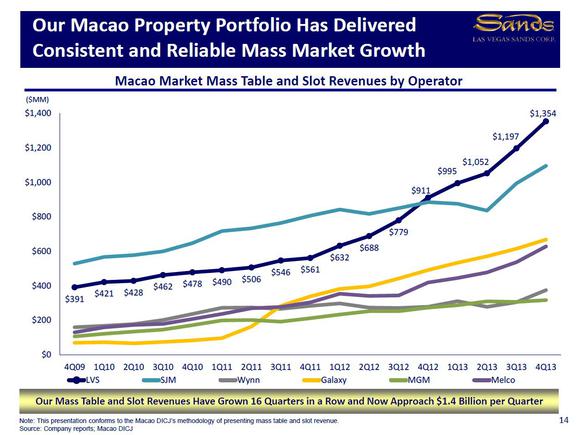 MGM is still losing money on a net income level, but the company is reaping huge benefits from its expansion in Macau lately. While total revenues increased by 10% during the fourth quarter of 2013, MGM China delivered a much stronger increase of 27% versus the prior year.