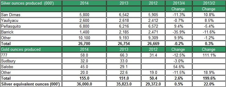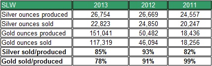 - Higher delay in delivery: In the past year, the drop in prices of gold and silver may have partly been responsible for the rise in delay of precious metals delivery. The new projects that were implemented also resulted in delays in deliveries. As of the last quarter of 2013, the amount of precious metals produced and not yet delivered reached 6.4 million silver equivalent ounces -- the highest level in recent years. If the price of silver remains low, the amount of bullion produced and not yet delivered is likely to remain high. The table below shows the ratio of silver and gold sold vs. produced in the past several years. As you can see the ratios of both gold and silver declined in the past year. If the ratios continue to fall, the company's revenue will decline in the following quarters.