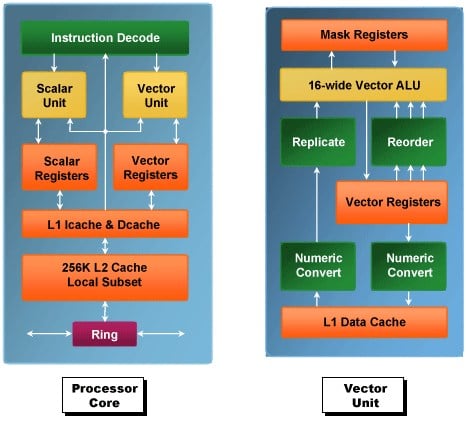 On the left is a Xeon Phi "core;" on the right is the vector unit. Source: Intel via ExtremeTech