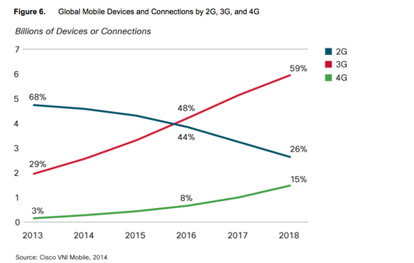 The increased mobile usage trends are only growing. By 2018, 4G will make up 15% of device connections, but will account for 51% of traffic.