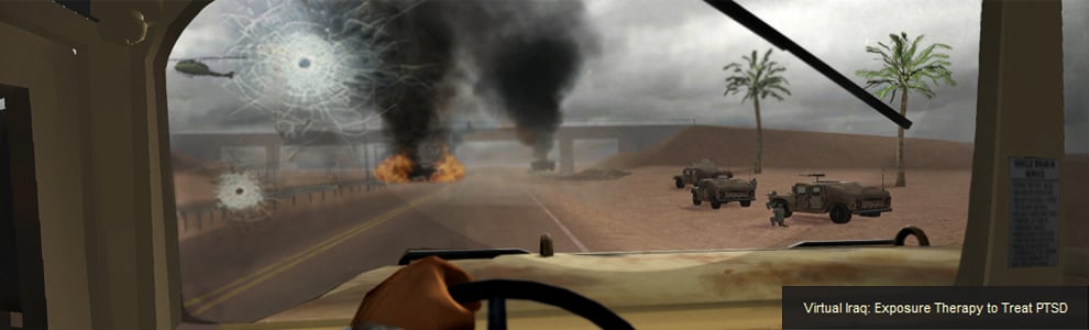 Dr. Rizzo immerses patients in a virtual reality program known as Virtual Iraq, which recreates a combat environment through weather conditions, ambient sound, and insurgent attacks -- all of which are carefully monitored and controlled by the clinician. Virtual Iraq has since been adopted by several military medical centers and 55 veterans affairs clinics across the United States.