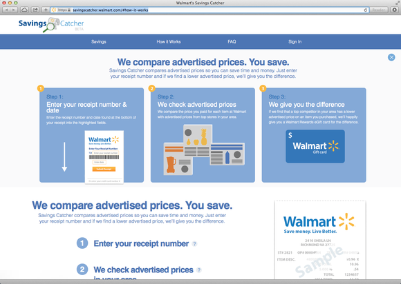 Savings Catcher has the potential to take price matching to the next level. Customers simply take a Wal-Mart receipt, type the receipt number into the Savings Catcher website, and Wal-Mart will search for lower prices on thousands of grocery, household consumable, health, and beauty products. If a lower price is identified, Wal-Mart will notify the customer and provide them with a Wal-Mart e-gift card. This saves bargain-hunting consumers from having to sift through ads as was required in previous price matching programs.
