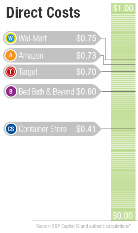As we saw before, when we look at the direct costs (i.e., the cost of inventory), The Container Store is in great shape, spending just $0.41 to make a dollar of sales -- way below its competitors.