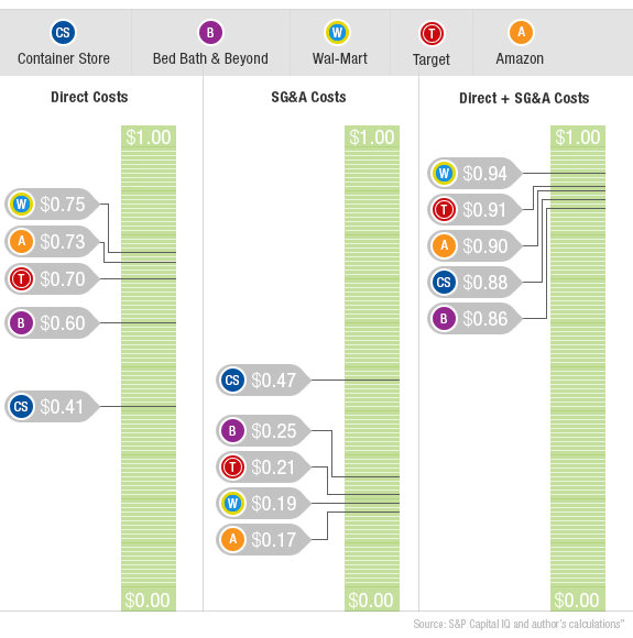 But when we get to selling, general, and administrative expenses (which includes the cost of The Container Store's employees), we see the story flipped on its head. You'll notice that The Container Store spends more on these costs than it does on the actual stuff that you're buying. Compare that to Wal-Mart and Amazon, which spend about four times as much on the products as they do on the people, rent, and marketing-type costs. Even Bed Bath, and Beyond comes in at two-and-a-half times.