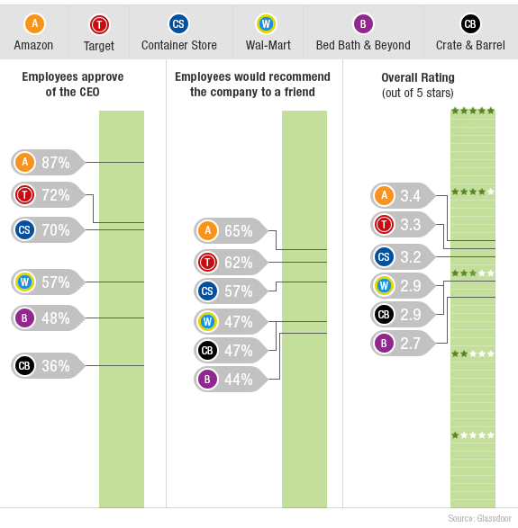 For a retail enterprise, The Container Store doesn't do badly. Employees like the CEO (Kip Tindell), a majority would recommend the company to a friend, and overall they give it 3.2 stars out of 5. In each category, it trails Amazon and Target, but does better than Wal-Mart, Bed Bath & Beyond, and Crate & Barrel. Still, given all the talk about employees, I'd expect better than middle of the pack.