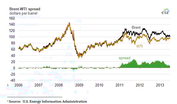 "And today, the going price for a barrel of U.S. crude is $96. That's about $11 less than a barrel sold in Europe," said Burnett who included the chart below with his Senate testimony.