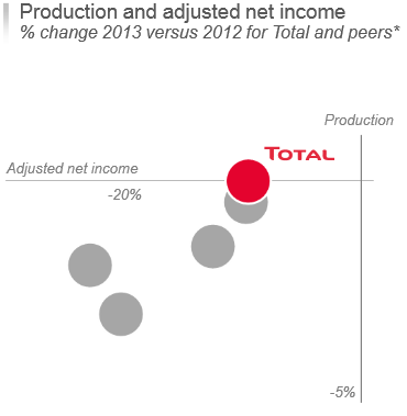All oil and gas companies see some amount of variability in their revenue and earnings due to the constantly fluctuating price of oil. However, Total did a remarkable job of keeping its production and profits stable in 2013 compared to 2012. This is much better than what its peers achieved. This chart comes directly from Total's 2013 results presentation and shows the year-over-year change in the company's production and adjusted net income relative to peer companies BP, Chevron, ExxonMobil, and Shell.