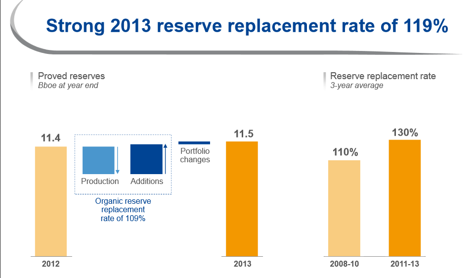 In a previous article posted here on The Motley Fool, I discussed the importance of an oil company's reserves in remaining a stable and going concern. Fortunately, Total has enormous reserves. In 2013, Total achieved an excellent reserve replacement rate of 119%. This means that the company discovered more resources than it pulled out of the ground.