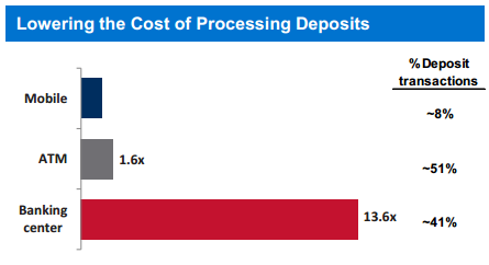 In addition, a bank like PNC would do wildly well to emulate the strategy of Starbucks -- and even Bank of America -- as it noted in 2013 75% of its deposit transactions were made at branch, and just 20% were made through ATMs, with the remainder on mobile.