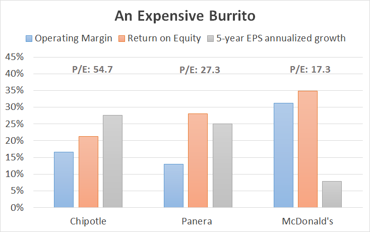 There is no doubt that Chipotle is a wonderful company and that its dedication to quality ingredients differentiates it from many of its peers. Operationally, Chipotle is top-notch with a high operating margin and an exceptional return on equity. However, the return that an investor achieves depends on the price paid for the shares, and in that regard Chipotle doesn't look so great. Here is a chart that compares Chipotle with Panera Bread (PNRA +0.00%), a smaller chain with similar characteristics, and McDonald's (MCD +1.53%), the global fast-food behemoth.