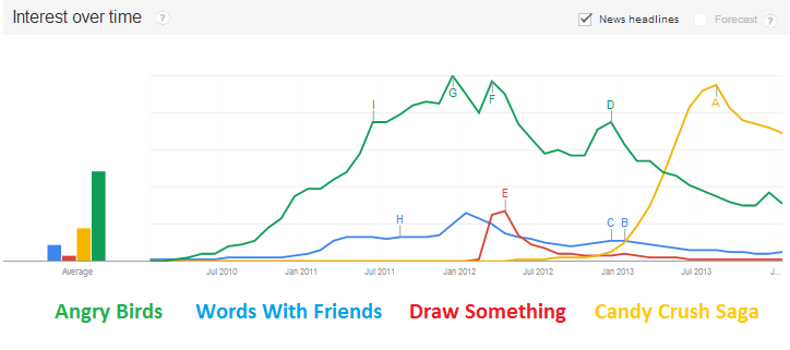 This graph shows the relative search volume for Angry Birds, a game from privately owned Rovio Entertainment, Words with Friends and Draw Something, once popular games from Zynga, and King's Candy Crush Saga, where I used the search term Candy Crush.