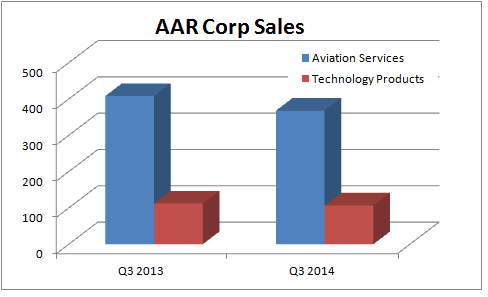 AAR Corp reports in two separate segments, and both saw lower sales in the quarter. Aviation services includes supply chain services, management, repair and overhaul (MRO), and airlift services. Technology products designs and manufactures structures and systems into the commercial and defense industries. As a rough guide, the company generates nearly 40% of its revenue from defense, with 29% coming from aviation services and 10% from the technology products segment.