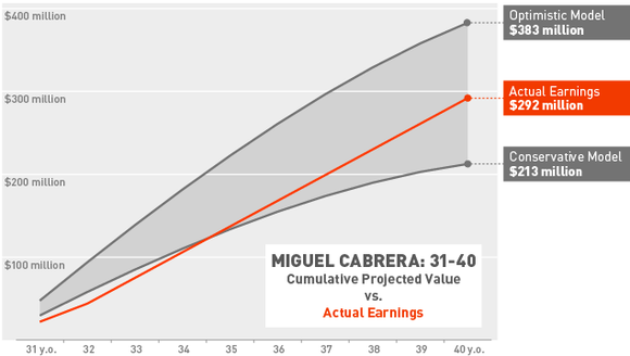 These figures also assume a clean bill of health. While Cabrera has averaged 157 games per year since 2004 -- his first full season -- the slugger is nearly 31. And whether it's Albert Pujols or Alex Rodriguez, plenty of previously bulletproof players have experienced major, career-altering injuries in their thirties. If Cabrera misses just one full year of his deal, the numbers begin to work against the Tigers.