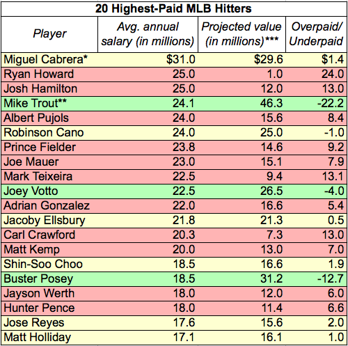 More often than not, the highest paid players appear to be overvalued. Over half of the top 20 -- those in red in the chart above -- likely won't deliver the output their salaries demand this season. And among this group, only a few look to be significantly underpaid. If Mike Trout, for example, plays as well in 2014 as he has the past two seasons, his production will be worth over $40 million!