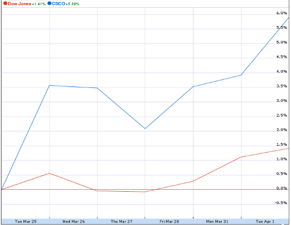 Case in point: Cisco Systems (CSCO 0.95%) is far and away the largest gainer among the 30 Dow Jones (^DJI 0.90%) stocks today. The networking specialist's shares are up 2.9% and 5.9% over the last week, easily besting the Dow's 0.3% and 1.4% gains, respectively.