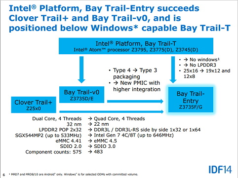 This is a performance- and cost-reduced implementation of the original Bay Trail-v0 that has shown up in numerous Windows 8.1 tablets. The maximum display resolution supported is lower (due to lower memory bandwidth), there is no support for LPDDR3, and the platform is Android-only. However, in exchange, the platform bill of materials is reduced significantly -- the number of components goes from 700 in Bay-Trail-v0 to 483 in Bay Trail-Entry, for instance -- making it more suitable for low-cost tablets without such a heavy contra-revenue offset.