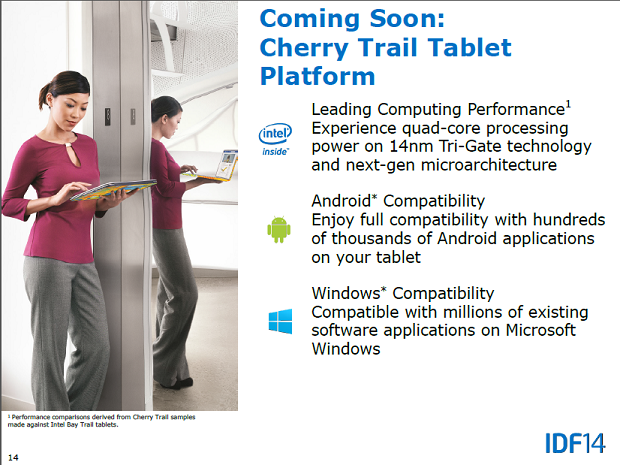 With Bay Trail, Intel looks as though it's targeting Windows 8.1 (all segments) and the low/mid-range of Android, leaving the high end to Qualcomm and NVIDIA (NVDA +0.99%). However, by the end of the year, Intel plans to introduce Cherry Trail-T. This will bring a solid improvement in CPU performance, a gigantic improvement in graphics performance, and likely a cost-optimized platform bill-of-materials from the get-go.