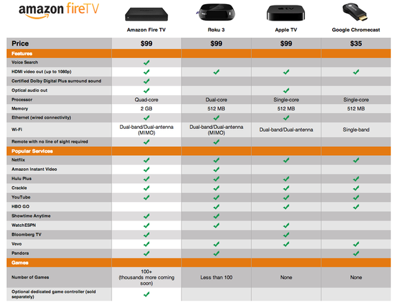 Voice search is another standout feature from Amazon's new set-top box. With Fire TV, users can simply speak a movie title, actor, or genre into the remote's built-in microphone and the device pulls up search results within seconds. This is certainly an improvement over Apple TV, which requires users to manually click one letter at a time on its alphabet grid. It is also a feature that is exclusive to Amazon's device, as you can see from the side-by-side comparison chart below.