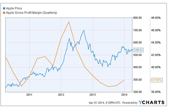 Facing increasing demand for smaller tablets, Apple launched the iPad Mini in February 2012. According to NPD Research, Apple expected the iPad Mini would account for 40% of total iPad sales. However, the Mini proved to be far more successful than Apple anticipated; Gartner estimated that the Mini accounted for 60% of iPad unit sales in the first quarter of 2013.Unfortunately for Apple, the iPad Mini's margins were significantly lower than the rest of the company's products, putting higher-than-expected pressure on the company's margins.The graph below shows the dramatic impact of the iPad Mini on Apple's margins and stock price.