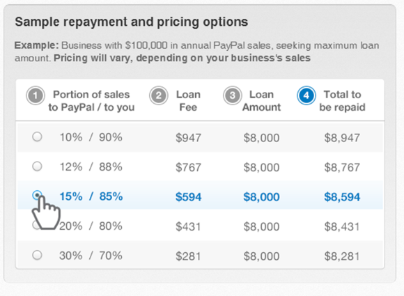 Like merchant loans, PayPal's product also varies based on payment volume. PayPal takes 10-30% of its customers' daily PayPal transactions until the loan is repaid in full, plus a fee. PayPal's fees are variable, based on the revenue split PayPal receives from the borrower.