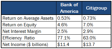 However, what is often unsaid about the two banks is Citigroup, even with its troubles, outpaced Bank of America across the best-known banking profitability metrics last year, as shown in the table to the right.
