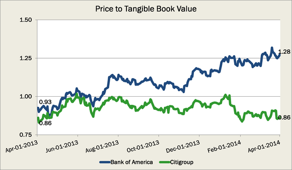 As you can see, in April of last year Bank of America traded at a slight premium to Citigroup. Yet Citigroup's multiple has been essentially flat over the last year, whereas Bank of America has watched its grow by nearly 40%.
