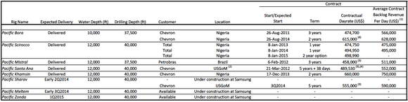 As this chart shows, Pacific Drilling has two rigs that will leave the shipyard in 2014 and 2015 that it has not yet secured contracts for. In addition, the company has two rigs that will come off contract in 2014 or 2015 that the company has not secured replacement contracts for.