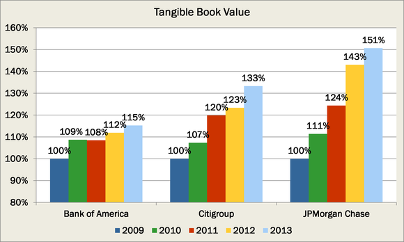 Since the end of 2009, JPMorgan Chase has been able to grow its tangible book value per share by more than 50%, from $27 to nearly $41. And Citigroup has seen its own also rise by an impressive 33%. Yet Bank of America has only watched its number grow by 15%: