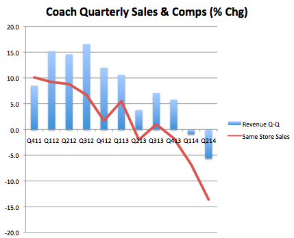 Aspirational brand Coach (COH +4.93%) has been terrible. The appearance of rival affordable luxury bag makers Michael Kors (KORS +2.86%) and Kate Spade (KATE +0.00%) gave consumers (and investors) an outlet for modifying their upwardly mobile tastes away from a brand they became all too accustomed to. While business has been horrible, there may be reason to believe it's only going to get worse.