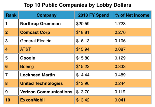 In fact, there is so little information out there, so little discussion of the topic on a company-specific basis, you may not have a clue how much your own stocks spend on lobbying. Here is a list of the top publicly traded companies from 2013, ranked by lobbying expenditures: