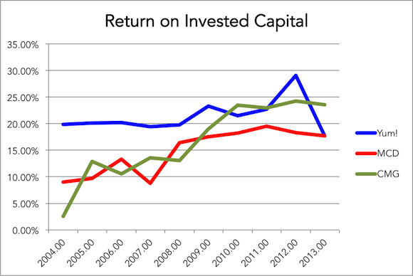 Chipotle is also proving to its shareholders that it knows what it's doing by way of managing its capital. The burrito maker is outperforming both Yum! and McDonald's by producing a higher return than its competitors on its invested capital. Chipotle has been fostering a steady increase in this return, which has stayed around the 23.5% range since 2010. McDonald's return has fluctuated between 17.7% and 19.5% in that same time-frame, while Yum!'s return on investment capital has been all over the place as it has hit anywhere between 17.6% and 29%, with the former occurring in 2013. Chipotle has been steadfast in keeping that percentage high, which proves that it outperforms its competitors in both social responsibility and capital management.