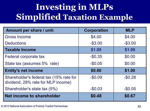 A master limited partnership, or MLP, operates in what is essentially a pass-through tax structure in which virtually all of the income is sent to investors via distributions. This structure eliminates the double taxation that occurs on dividends paid by a corporation. In addition to being a fantastic tax loophole, the structure provides a nice income stream for investors, as a MLP typically pays out all of its income. Furthermore, as the following simplified example shows, an investor would be able to keep substantially more of the income stream a business produces by investing in a MLP.