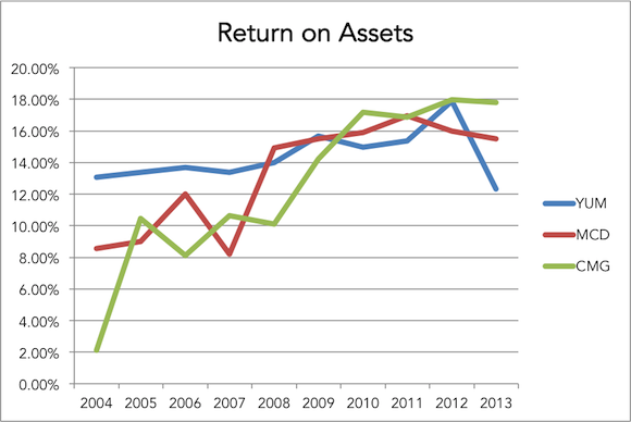 Yum! (parent company to Taco Bell, KFC, and other chains) saw pretty steady ROA growth until 2012, at which point its return plummeted from almost 18% to the lowest point it has seen in a decade, just over 12%. Perhaps this was due to the company's inability to effectively manage the effect that an outbreak of avian flu had on its KFC sales in China.