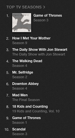 According to the latest figures from iTunes, Game of Thrones season 3 is the top seller among all available TV seasons. The win comes amid huge ratings for AMC Networks' (AMCX +0.00%) The Walking Dead, which drew 15.7 million viewers to the season 4 finale -- a 27% increase over last year's conclusion. The show has also garnered huge interest among iTunes viewers, ranking third on the full-season sales chart.