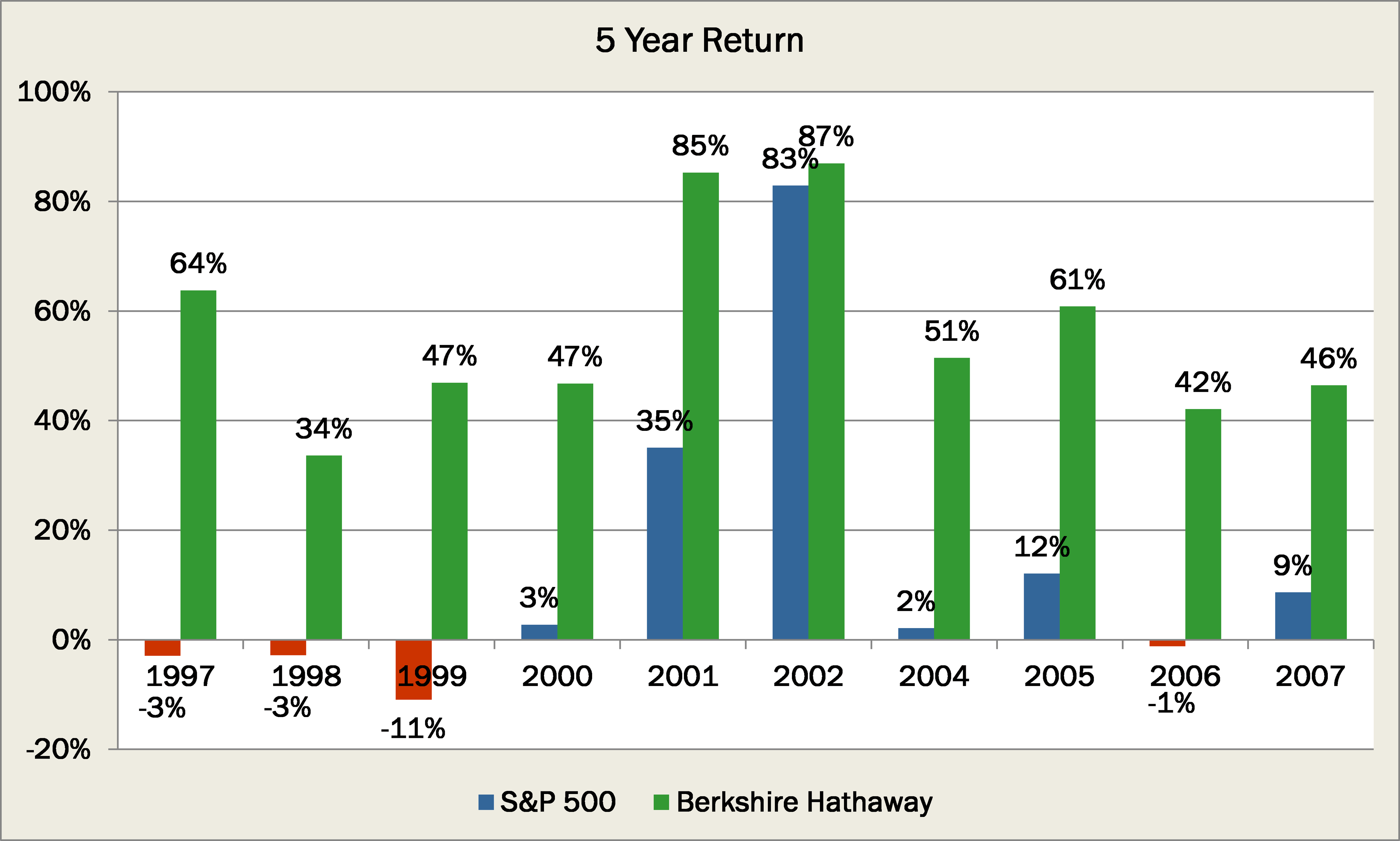 Charlie Munger, Berkshire's vice chairman and my partner, and I believe both Berkshire's book value and intrinsic value will outperform the S&P in years when the market is down or moderately up.