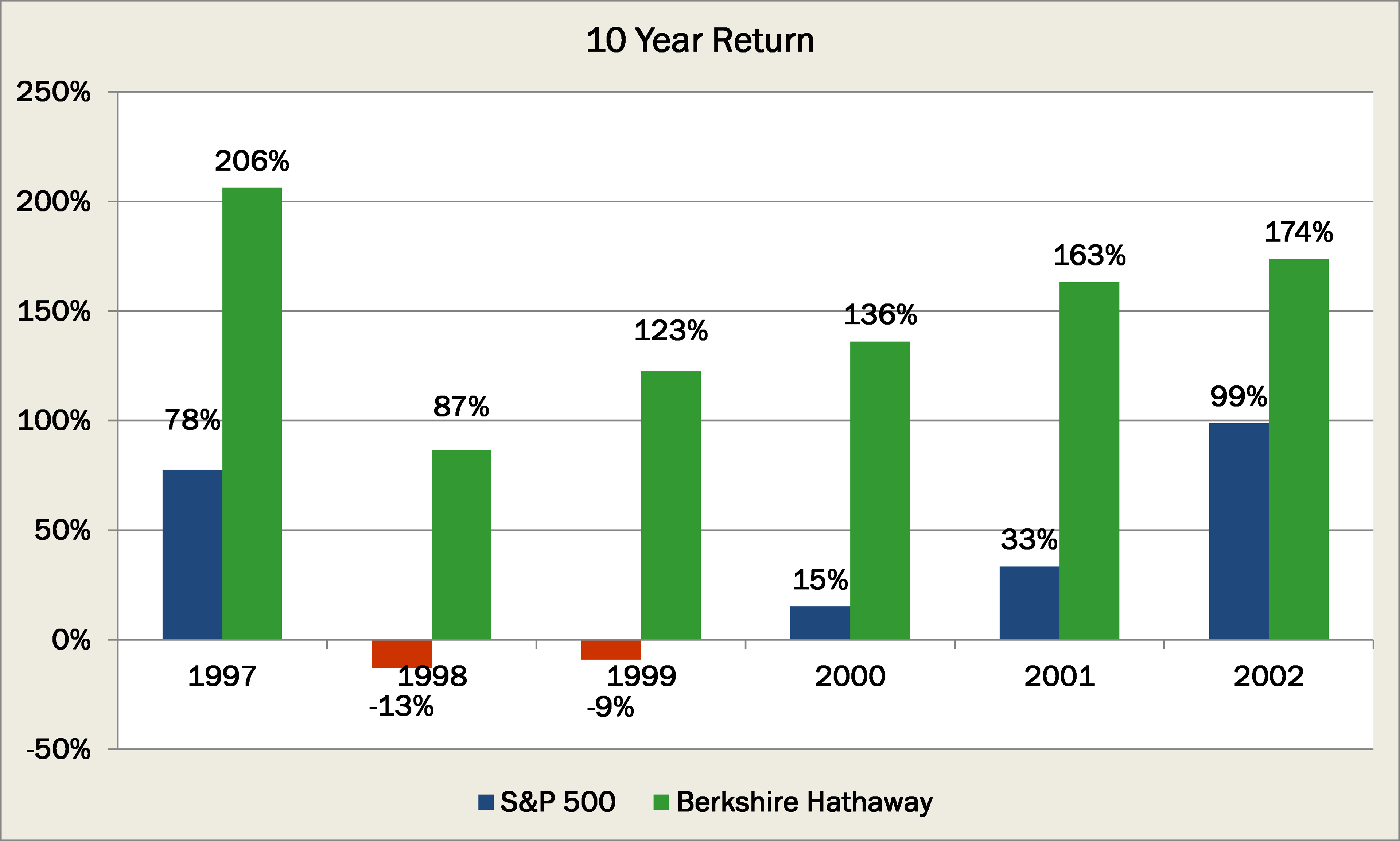 While the gap is narrowed slightly, Berkshire Hathaway resoundingly beats it, once again. The S&P 500 delivered an average annual return of 3%, and Berkshire saw its book value rise to 9.5%. And although a difference of 6.5% per year may not sound like a lot, the S&P 500, on average, saw a 10-year total return of just 35%, compared to a staggering 150% by Berkshire Hathaway.