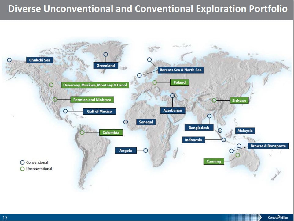 As the following map from a recent investor presentation details, ConocoPhillips has a number of both conventional and unconventional exploration opportunities within its current portfolio.
