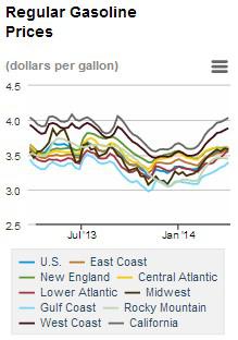 At these latest prices, the West Coast pays the prettiest penny for gasoline ($3.88), while the East Coast doles out $4.075 for diesel. Meanwhile, the Gulf Coast can guzzle gas for just $3.392 and diesel for $3.793 per gallon.