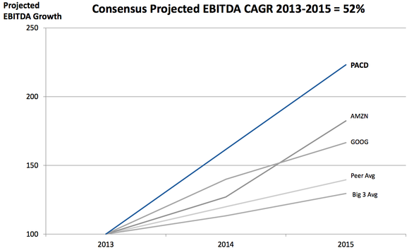 Pacific Drilling itself provides evidence of this in its presentation at the Howard Weil 42nd Annual Energy Conference. Here is a chart the company included in this presentation that shows how analysts expect its EBITDA growth to stack up against that of a few other high-growth companies and that of its peers: