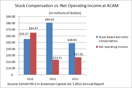 Pay for performance doesn't seem to exist. In 2013, American Capital Asset Management added only $296 million in fee-earning assets, according to its fourth-quarter presentation. That would translate into less than $4 million in annual revenue at an average fee of 1.25%. Despite this unimpressive performance, other compensation tallied to $55 million last year.