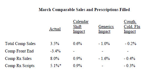 Just as in the case of Walgreen, Rite Aid enjoyed a healthy showing in its pharmacy comparables, which soared 3.5%. This too was offset by a less-than-ideal front-end performance. Compared to the same month a year earlier, Rite Aid's front-end comparables fell 5% as a shift in the timing of Easter negatively affected its front-end sales by 4.1%.