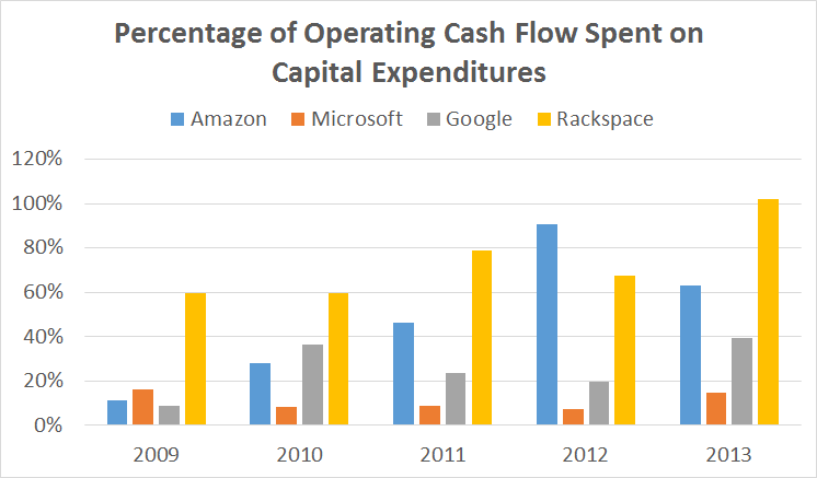 It's clear from this chart why Rackspace is going to have a difficult, if not impossible, time competing with the big three. In 2013, Rackspace spent more than 100% of its operating cash flow on capital expenditures, meaning the company is burning through cash just trying to keep up. Faced with a price war, Rackspace simply has no room to absorb any serious price cutting.