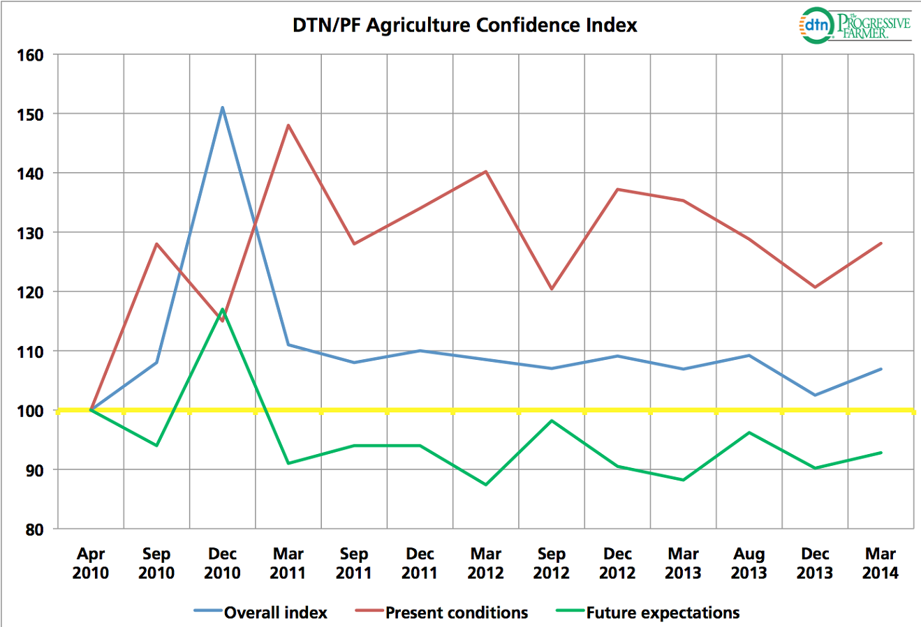 With the weather and crop prices becoming more uncertain, farmers may increasingly adopt the wait-and-watch approach when it comes to spending. Robert Hill, an economist at Caledonia Solutions who helped with the Ag Confidence Index survey, put it into perspective: "The big surge in capital expenditures on farm equipment and land is behind us. We have entered a period of more rational behavior on such expenditures."